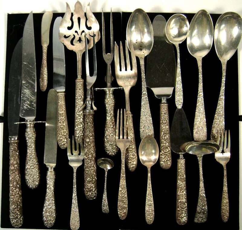 "Southern Rose" pattern, comprising twelve each salad forks, soup spoons, dinner and butter knives; eleven each dinner forks and teaspoons; and three serving pieces; together with a similar design by Stieff, "Rose" pattern, comprising twelve dinner knives; eleven salad forks; seven serving pieces; and four butter knives; also with five additional serving pieces of a similar design, probably Kirk-Stieff. (112).