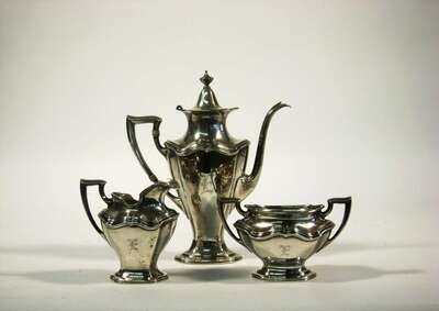 Comprising a coffee pot, sugar, and creamer, each slender in form with undulating reeded band to the shoulders, monogrammed.