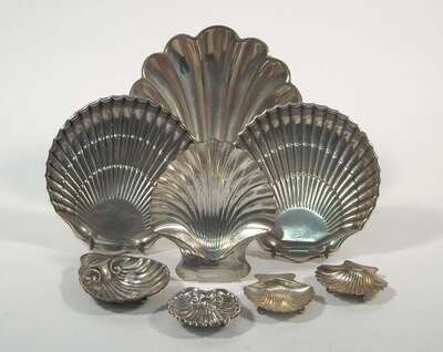 Including a large Gorham shell; pair of scallop-form dishes, one Fisher, the other M. Fred Hirsch Co.; and five others (two with marks for Tiffany & Co.). (8).