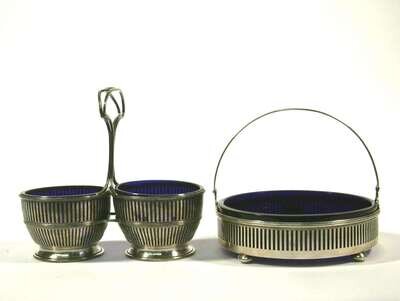 Sterling silver swing-handled basket and condiment stand with cobalt glass liners watson & co., attleboro, ma, first half 20th century
