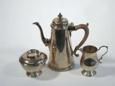 George II style, comprising a coffee pot with wood handle, covered sugar, and creamer, the underside of coffee pot marked "Reproduction Thomas Evesdon, London, 1725."