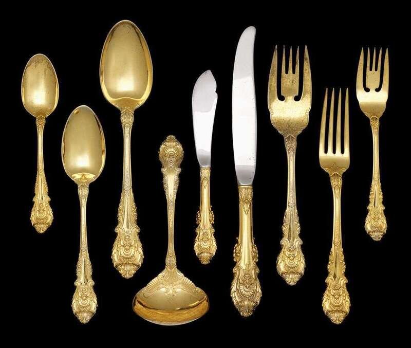 "Golden Sir Christopher" pattern, comprising sixteen teaspoons; eight each dinner knives, dinner and salad forks, tablespoons; two serving spoons; and a ladle, serving fork, and butter knife. (53).