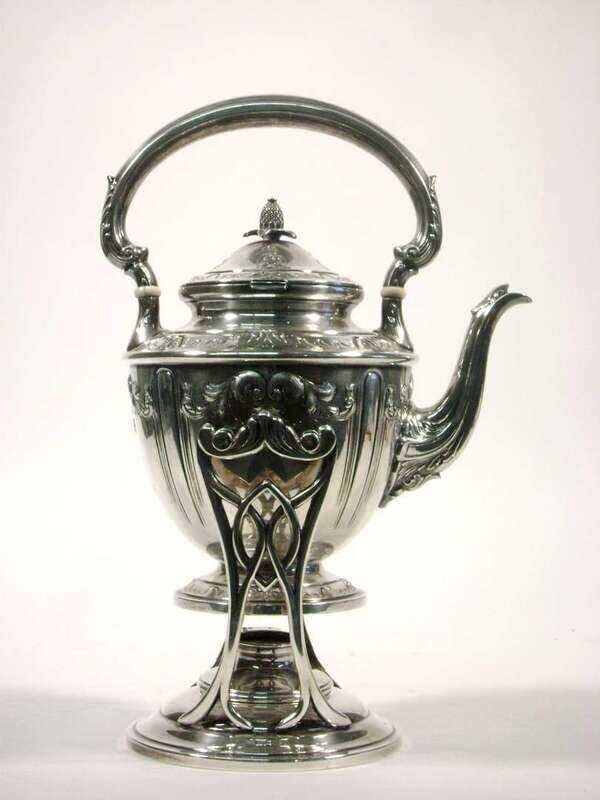 Sterling silver tea kettle on stand with burner mueck-carey co., new york, ny, circa 1940s or 50s