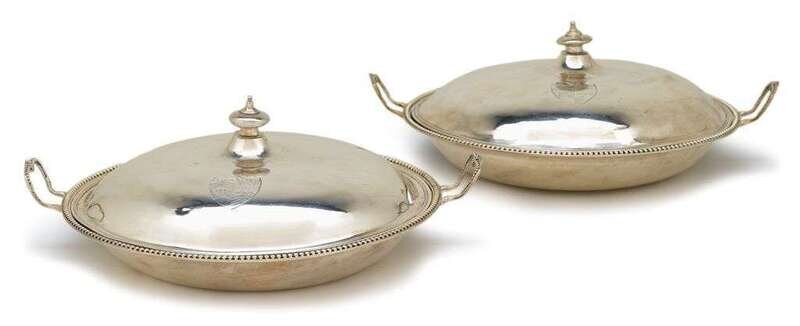 Circular form with beaded rims, the lid and basin of each dish engraved with a coat-of-arms, one lid associated and with rubbed marks, possibly William Grundy, 1776-77.