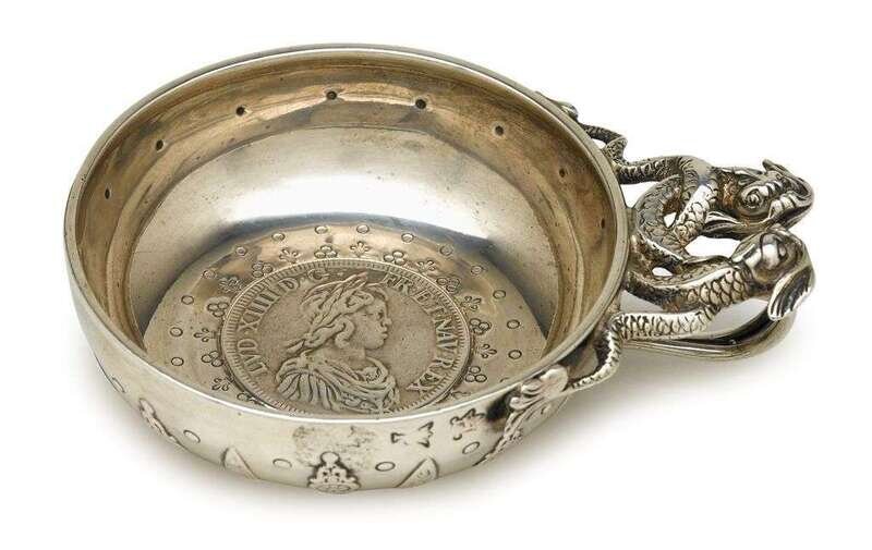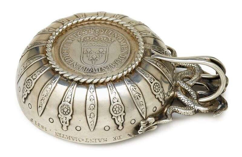 The circular vessel with interlaced dolphin-form handle and inset with a 17th century coin framed by an alternating fleur-de-lis and circular design, engraved "De Saint-Martin, 1651" below the rim, charge mark for 1704-12.