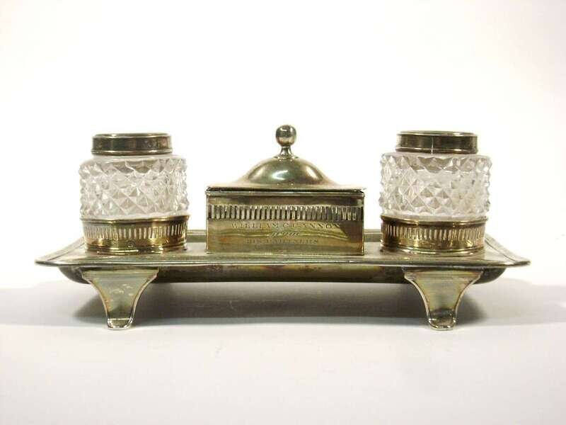 The rectangular stand raised on four outcurving legs with well for pens and fitted with glass pounce pot and inkwell, engraved with later presentation inscription.
