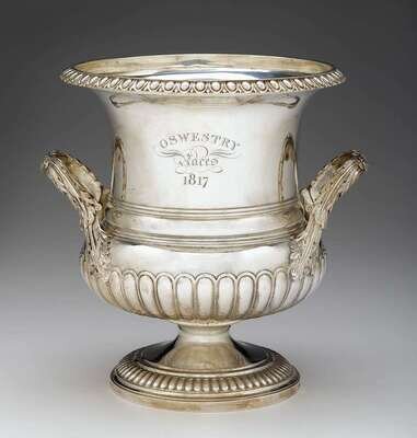 Of campana form with egg and dart rim, the partially fluted lower body with applied foliated handles above circular domed gadrooned foot, with engraved presentation inscription "Oswestry Races, 1817."