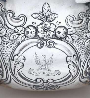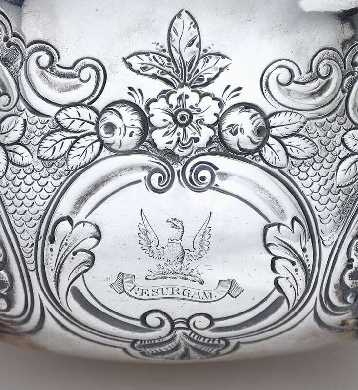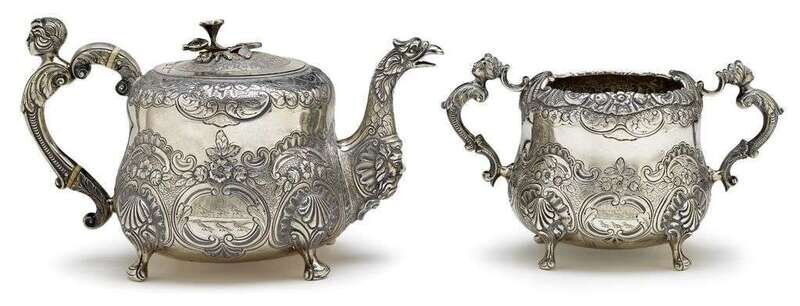 The repoussé and chased teapot and open sugar or wastebowl of squat form with engraved scale-work design surrounded by floral blossoms and C-scrolls and raised on shell-capped scroll feet, the teapot with phoenix-shaped spout and bearded mask below, the sugar with twin maiden-form handles. Engraved with the Fenwick family crest of a phoenix in flames murally gorged above the motto "Resurgam" (I shall rise again).