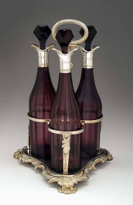 The triangular stand, with scrolling foliate design, raised on three shell feet and fitted with three amethyst glass bottles, the collars engraved "Scotch Whiskey," "Bourbon Whiskey," and "Rye Whiskey."