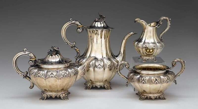 Comprising a tea and coffee pot, creamer, and open sugar, of melon form with chased repoussé floral and foliate bands, leaf-capped handles, and floral finials, each raised on four shell and scroll feet.