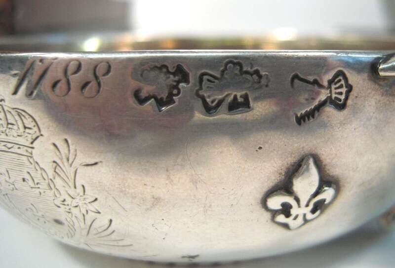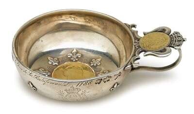 With coin set into handle surmounted by a crown, the circular bowl with a coin to the center surrounded by fleur-de-lis, and the exterior engraved "Don de Royale ?Amilie offert par nous a M. le Duc de La Rochefoucauld, 1788," charge mark for 1780-89.