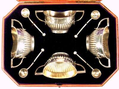 Comprising four twin-handled salts and four spoons with ball terminals, in original plush-lined goat skin case.