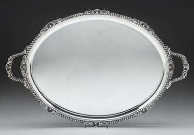 The oval tray with gadrooned rim interspersed with shells and acanthus leaves.