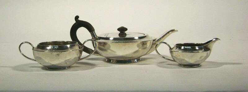 The Art Deco service comprising a teapot with ebonized wood handle and finial, open sugar, and creamer, each of squat circular form.