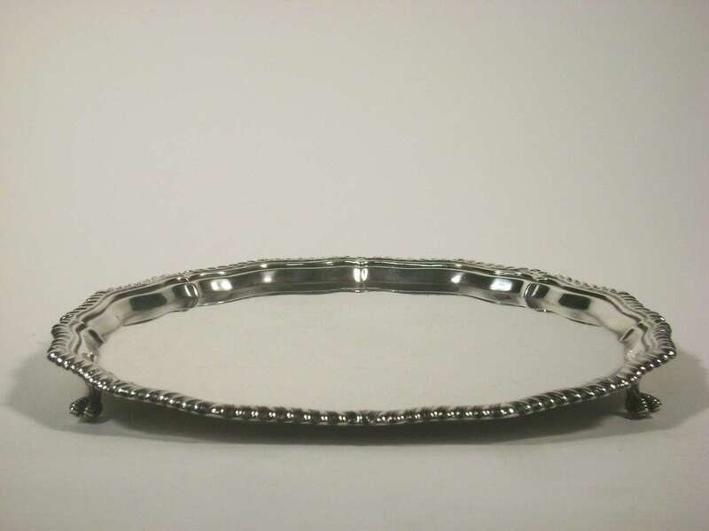 Shaped circular form with gadrooned rim raised on three ball and claw feet.