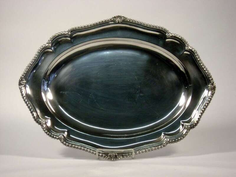 Shaped oval form with gadrooned rim interspersed quarterly by four shells, maker's marks rubbed.