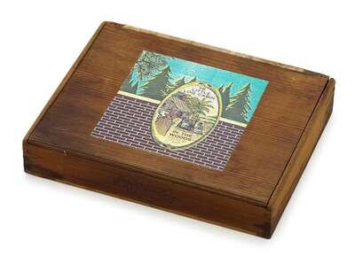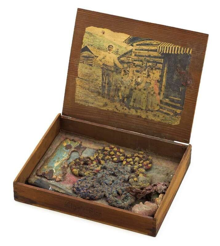 Signed and dated 1976 in marker on the underside, wood cigar box with screenprinted labels adhered to the top and undersides, containing mixed media/assemblage