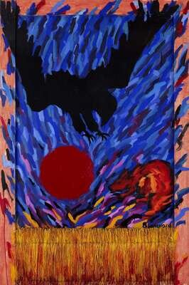 Signed bottom right, oil on masonite, plastic, straw and wood