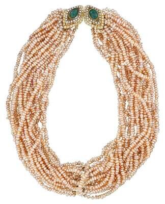 14 karat yellow gold multi strand pearl, emerald and diamond necklace