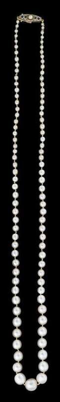 Graduated natural pearls, approximately 2.09mm - 7.70mm. platinum topped 18 karat yellow gold clasp accented by petite rose cut diamonds, calibre cut sapphires and single pearl.