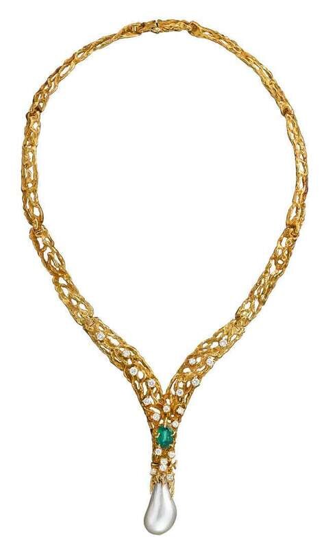 18 karat yellow gold diamond, emerald, and natural baroque pearl necklace, Arthur King