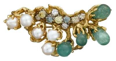 18 karat yellow gold emerald, diamond, and pearl brooch, Arthur King