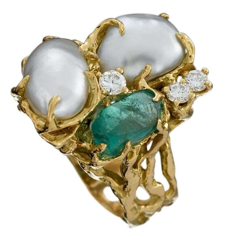18 karat yellow gold pearl, emerald, and diamond ring, Arthur King