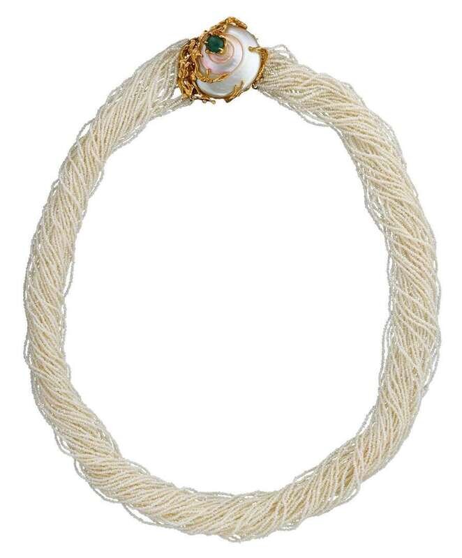 Multiple strands of tiny seed pearls. 18 karat yellow gold accented shell clasp, featuring oval cabochon emerald, branch-like motif. Signed by the maker. Accompanied by original gift pouch.