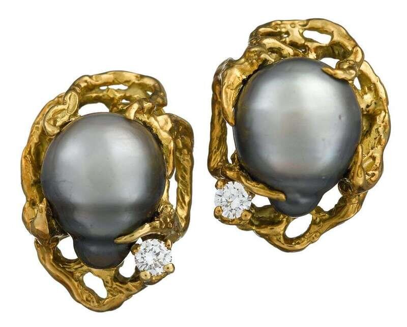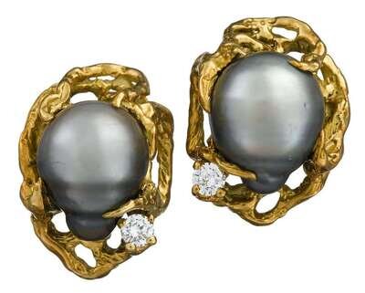 18 karat yellow gold pearl and diamond earrings, Arthur King