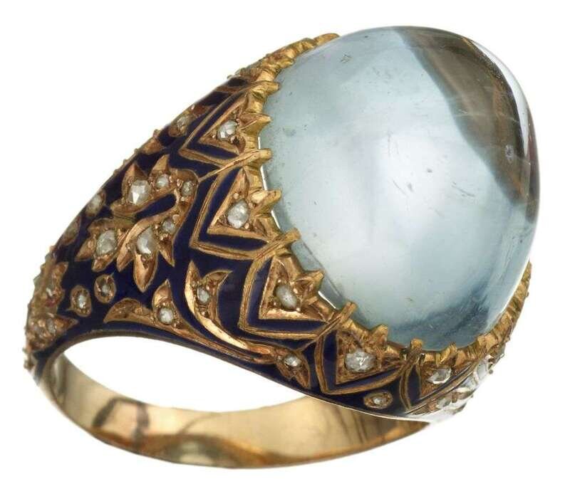 Cabochon topaz approximately 15.85 carats. Accented by petite rose cut diamonds and dark blue enamel detailing, bombe style.
