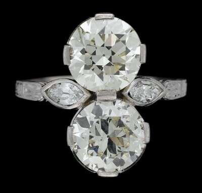 Featuring two round old european cut diamonds, approximately 1.70 and 2.12 carats, accented by a marquise cut diamond on each side.