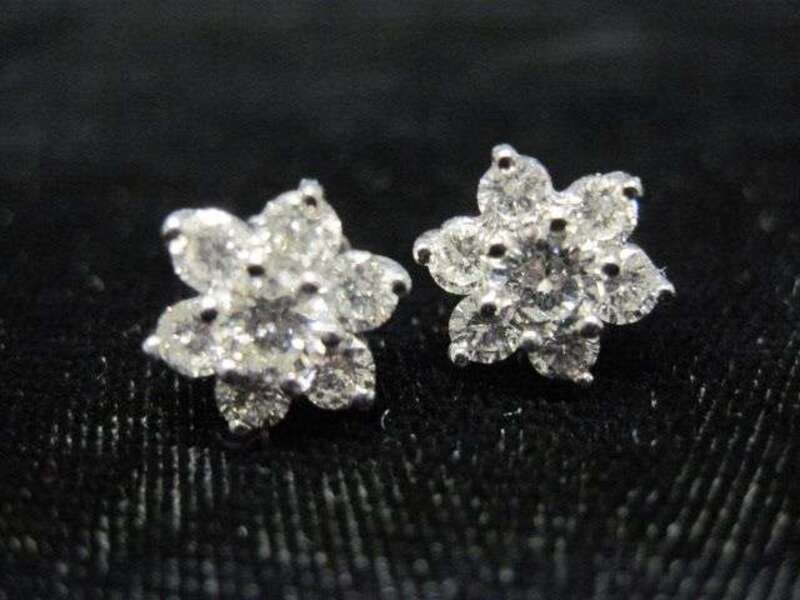 Seven round cut diamonds each, total diamond weight for both earrings, approximately 1.70 carats. French post backings. Signed by the 'SES'.