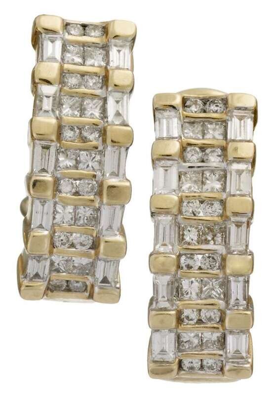 Petite round, princess and baguette cut diamonds, total diamond weight for both earrings, approximately 1.44 carats. Channel set, french post and omega backs.