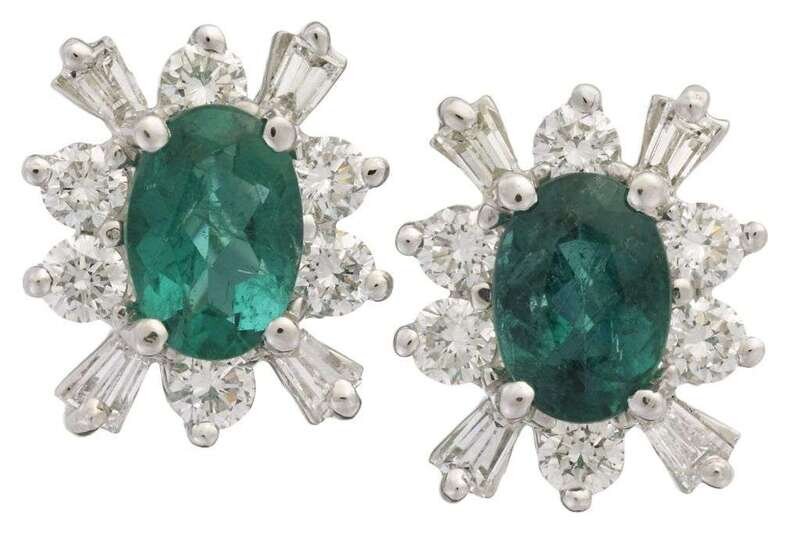 Oval cut emeralds, approximately 2.05 carat total weight, surrounded by six round cut diamonds and four tapered baguettes, total diamond weight for both earings, approximately 1.60 carats. French post and omega backs. Displaying maker's mark.