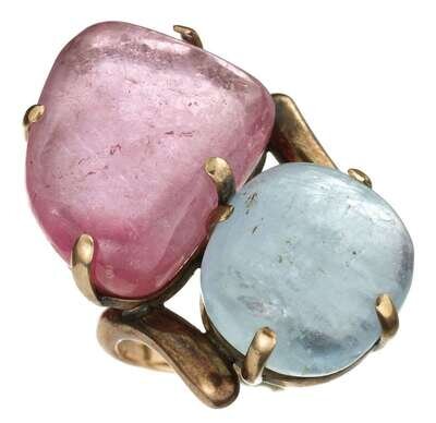 Large polished tourmaline and aquamarine stones, by-pass style setting.