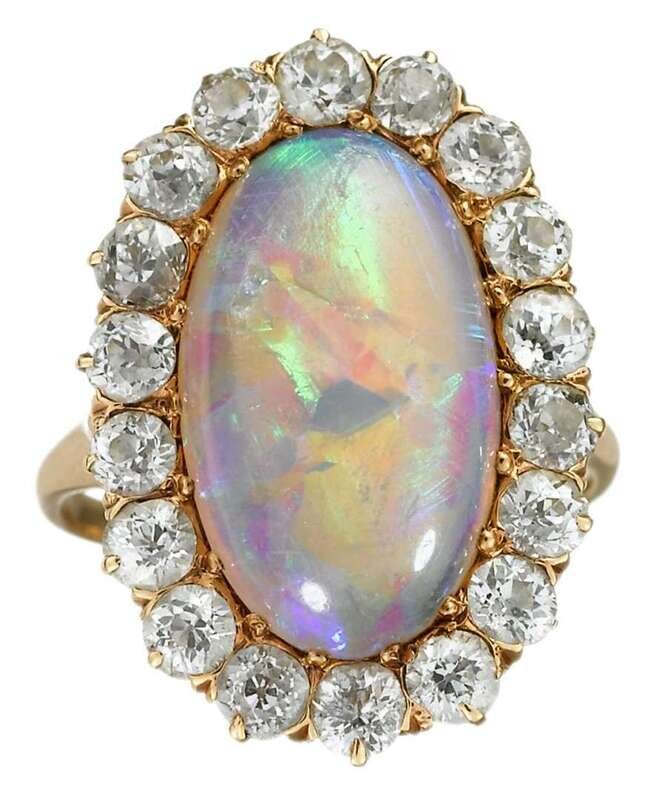 Oval cabochon opal approximately 3.90 carats, round cut diamond surround. Inscribed 1869. Ring was at one time resized, maker's mark possibly lost at this time. Accompanied by Mauboussin for Trabert & Hoeffer box.