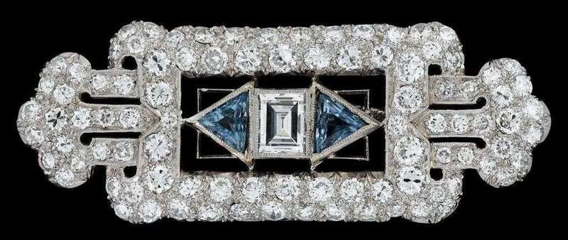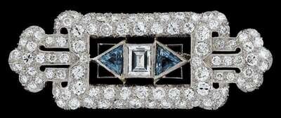 Featuring a center emerald cut diamond, approximately 0.63 carats, flanked by triangle cut aquamarines, petite round cut diamond surround. Total diamond weight of brooch, apporximately 4.48 carats.