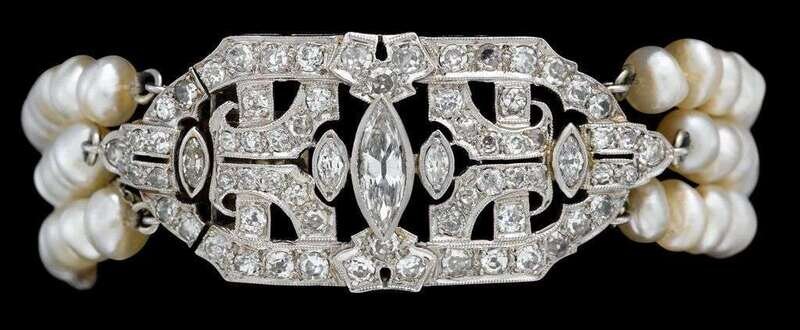 Triple strand natural pearl bracelet, diamond set clasp, center marquise cut diamond, approximately 0.64 carats. Inscribed 'EPE to ANN 6-5-32'.