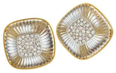 Rounded square form carved ribbed crystal featuring pave diamond center. French post and omega backs.