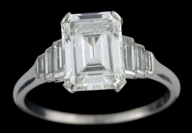 Emerald cut diamond, approximately 2.71 carats. Flanked by three graduated baguette cut diamonds on either side. Inscribed J.L.B. to M.A.J.