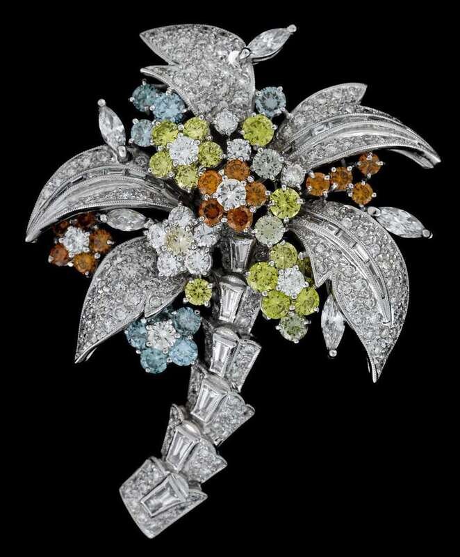 Platinum diamond, and colored diamond 'palm tree' brooch