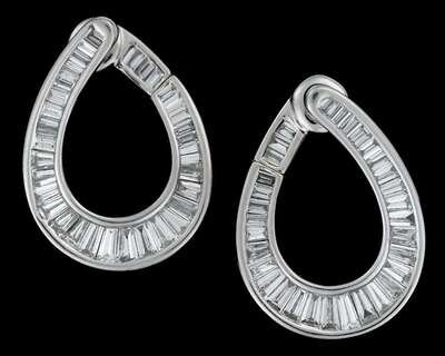 Channel set baguette diamonds in a open drop shape. Total diamond weight for both earrings, approximtely 6.00 carats. French post and modified omega clip backings.