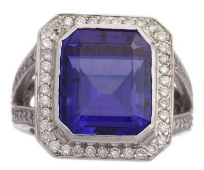 Emerald cut tanzanite, approximately 11.41 carats. Petite round cut diamonds surrounding and along split shank, approximately 1.17 carat total weight.