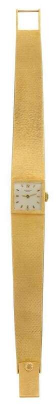Square cream enamel face displaying Arabic and dash dial, signed by the maker, case no. 999792, mechanical movement signed by the maker, no. 2682987. Original textured 18 karat yellow gold bracelet. Accompanied by original box and outer box.