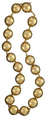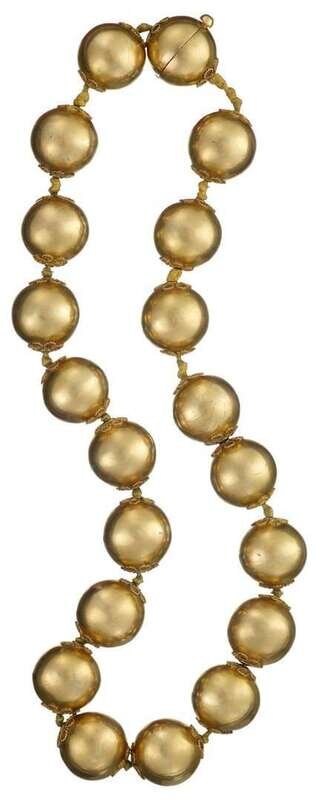 Large gold beads, approximately 16.5mm. Accented by twisted gold rope detailing. Split bead clasp, featuring internal pin closure. Strung on yellow silk thread.
