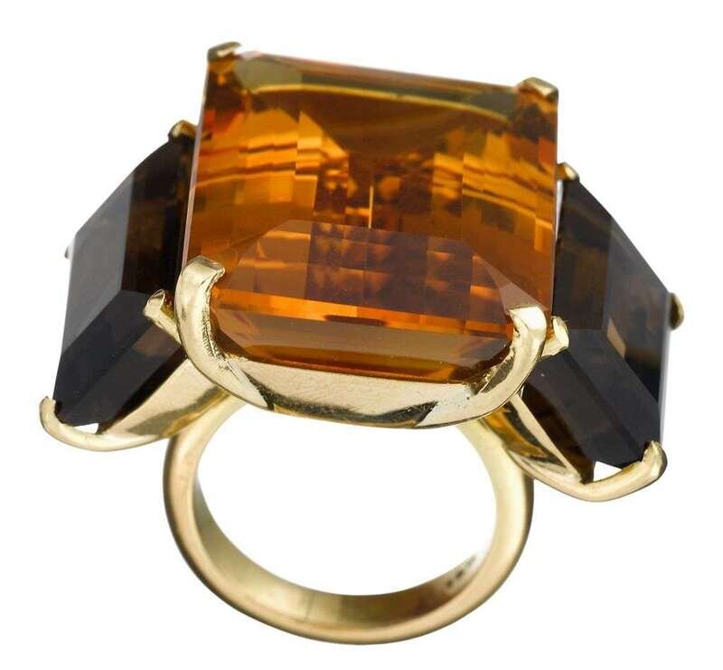 Retro 18 karat yellow gold citrine and smoky quartz cocktail ring
