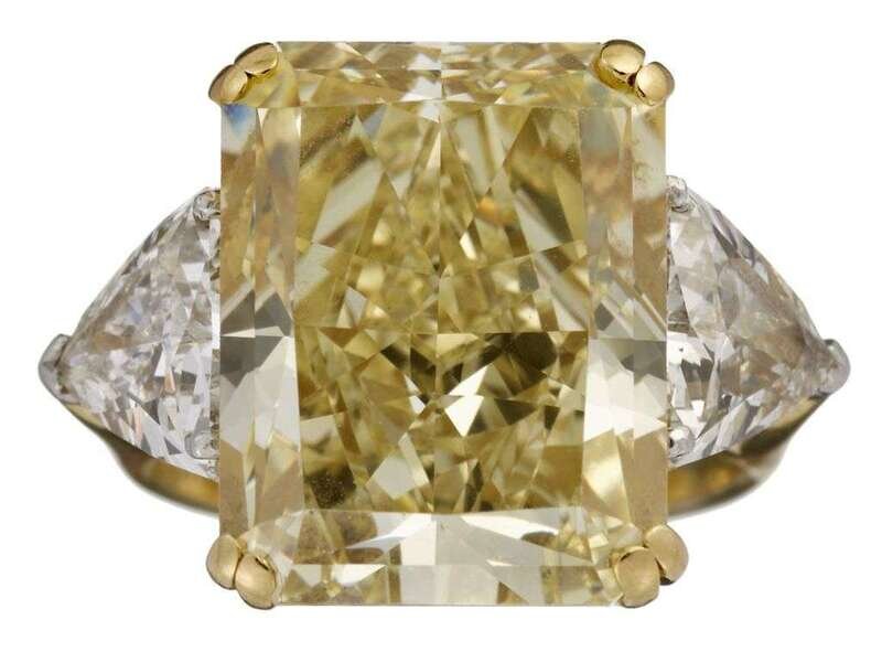 Radiant cut fancy yellow diamond, 14.87 carats, VVS2 clarity. Flanked on both sides by trillion cut diamonds, approximately 2.20 carat total weight. 18 karat yellow gold setting.