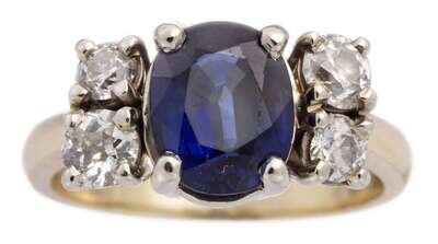 Oval cut sapphire, approximately 2.29 carats. Flanked on both sides by two round brilliant cut diamonds.