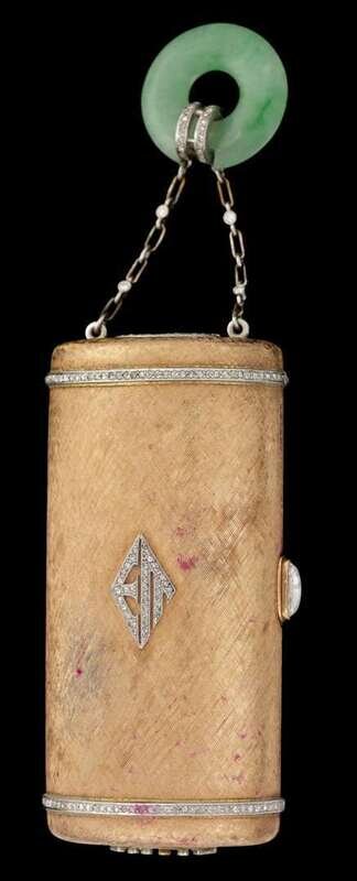 Florentine finish oval rose gold case, accented with petite rose cut diamonds, and petite diamond monogram on front. Interior features money clip, powder, rough, and lipstick holder. Diamond accented chain and carved jadeite 'pi' handle.