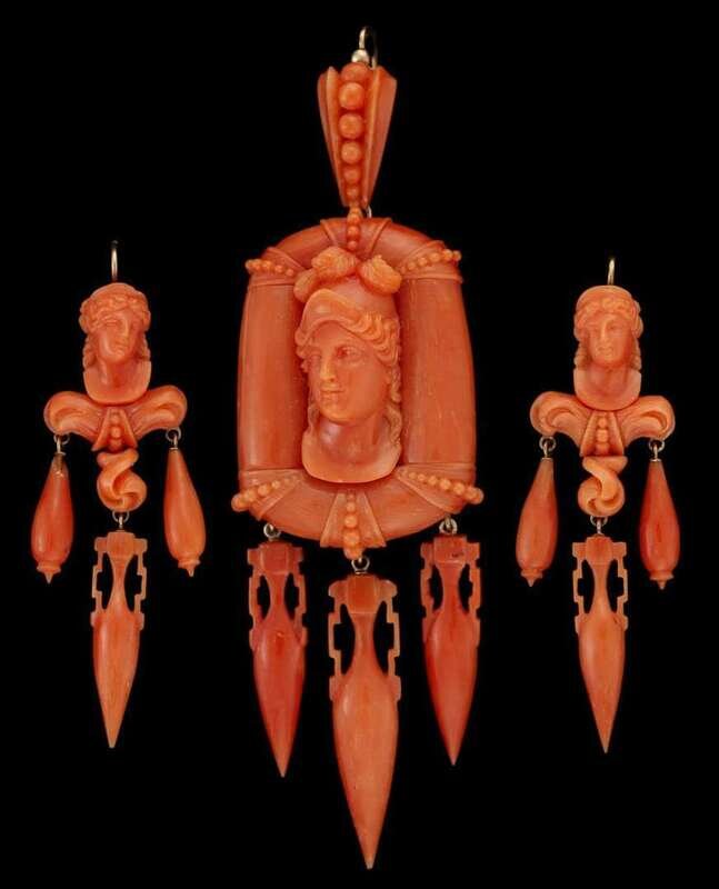 High relief carved coral depicting a female profile, accented by three articulated amphora drops. Earrings of similar design. Accompanied by original fitted box and two spare amphorae.